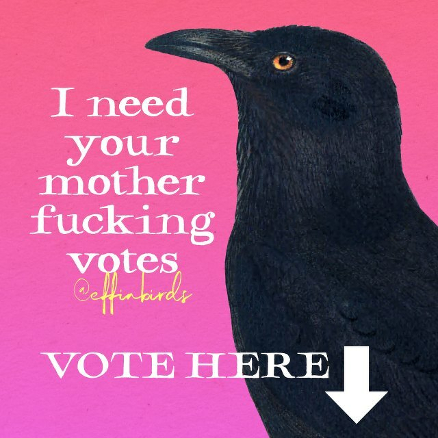 What’s up, bird friends? Your pal Effin’ Birds has been nominated for another Webby Award, this time in the Animal category, so I’m facing off against a century old publishing giant and a fuckin’ television network.